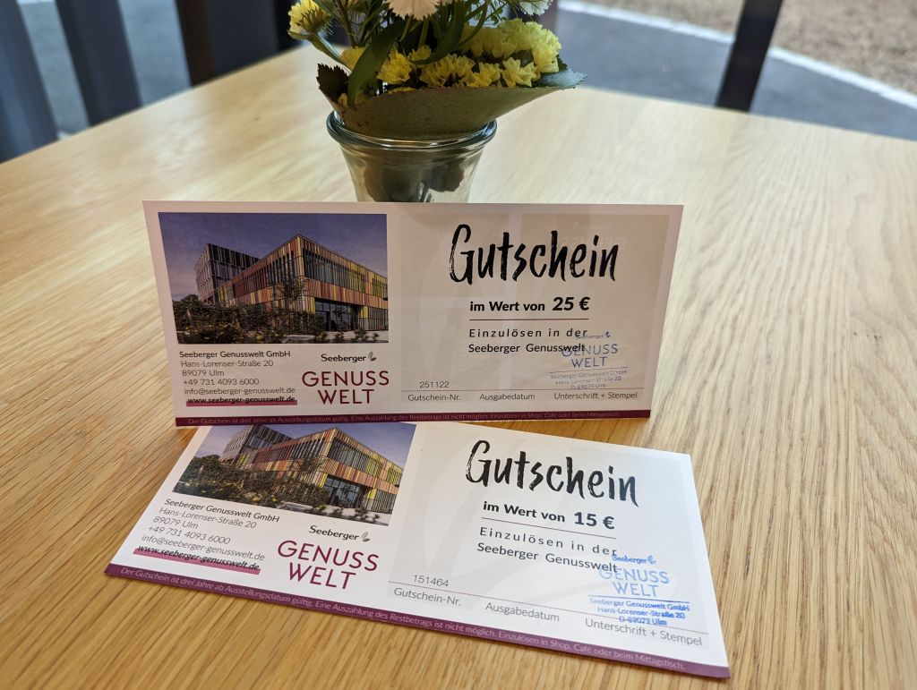 Ab sofort können Sie hier online Gutscheine für unser Café, den Genussmarkt und das Restaurant kaufen und direkt zu Hause ausdrucken.